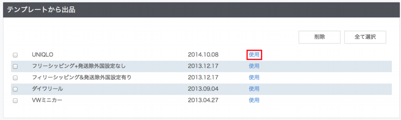 保存されたテンプレートの一覧が表示されますので、「使用」のリンクをクリックする