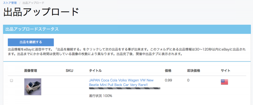 出品作成で作成した商品を出品した時に、こちらのページに入りeBayに送信されます。