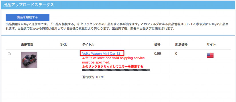 入力の不備などがあった場合にはエラーメッセージが表示されますので、タイトルをクリックして出品フォームを開き編集後再度出品をして下さい。