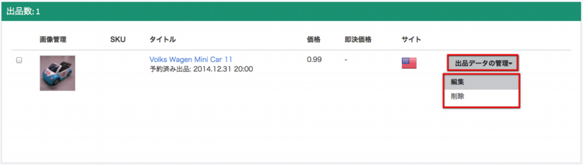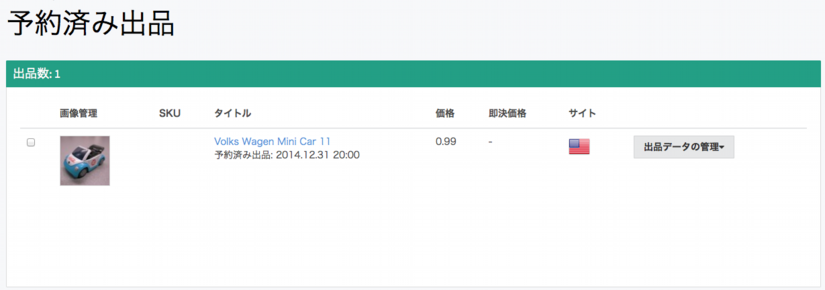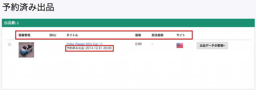 予約出品される日、画像、SKU、タイトル、開始価格、即決価格、出品サイトのデータが、この表に表示されています。