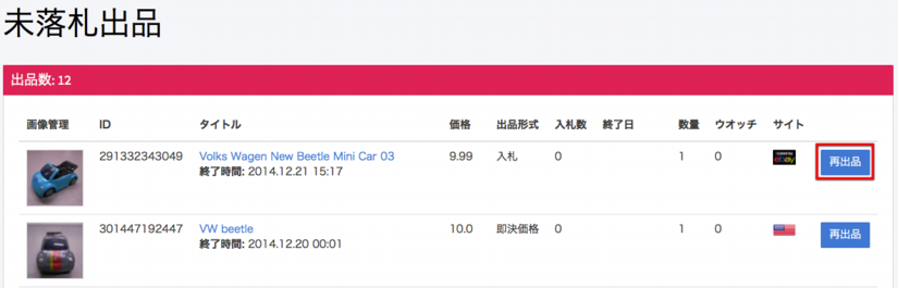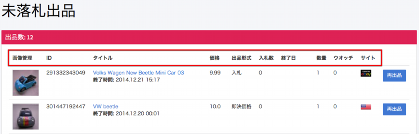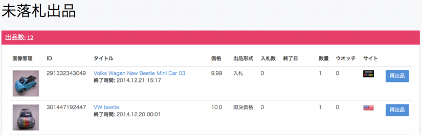 ※未落札出品のリストに表示されているデータは、eBayの「Unsold」リストから読み込んで表示しています。リストから商品を削除するには、eBayの「Unsold」リストから削除をしますと表示されなくなります。