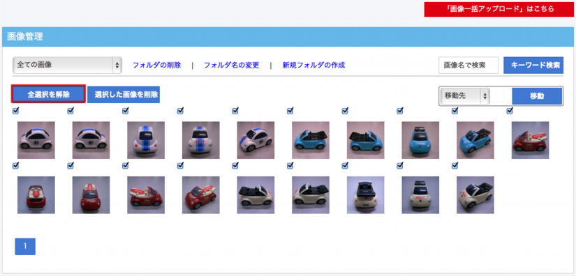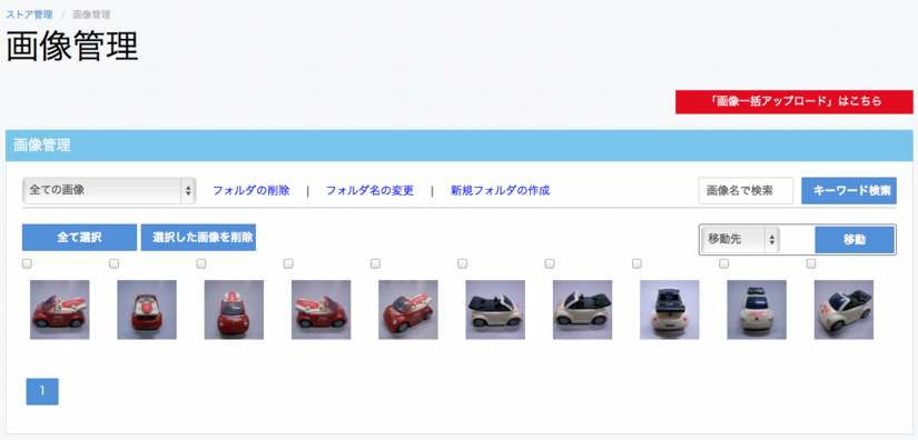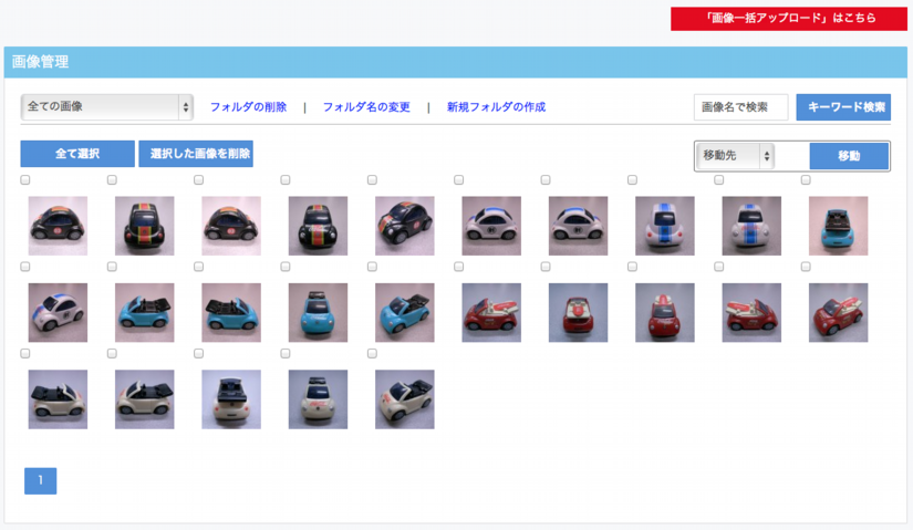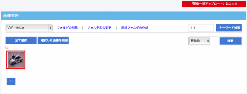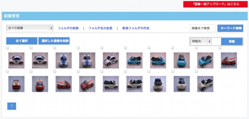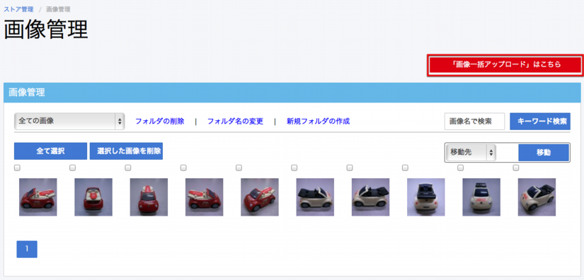 まずは、画像のアップロードをしてみましょう。「画像一括アップロードはこちら」をクリックします。