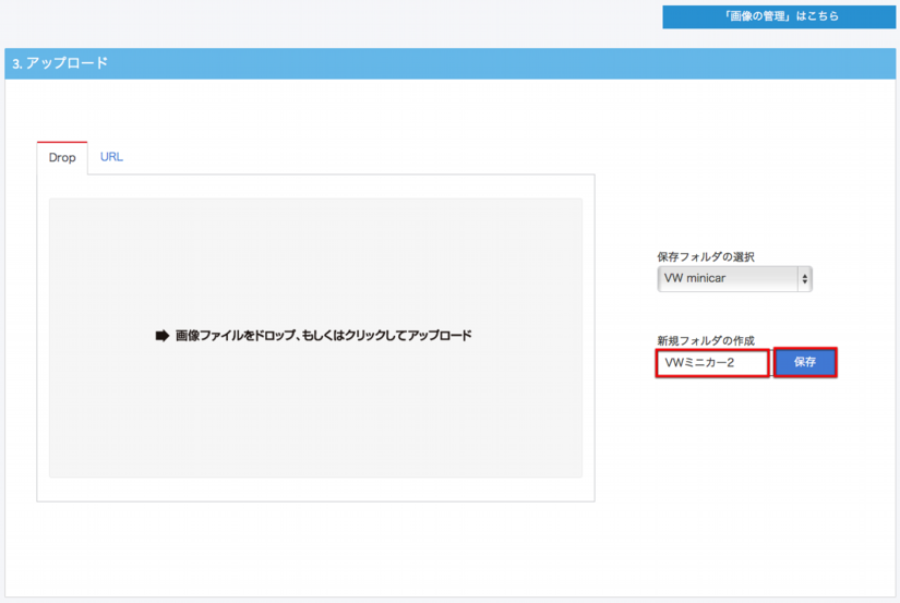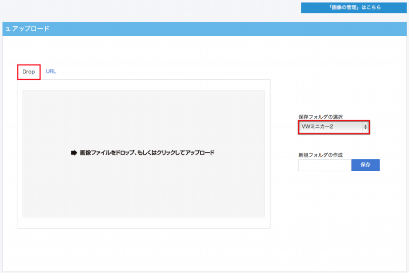 プルダウンに「VWミニカー2」というフォルダ名を確認したら、「Drop」か「URL」のタブをクリックしてアップロード方法を選びます。