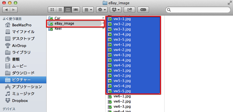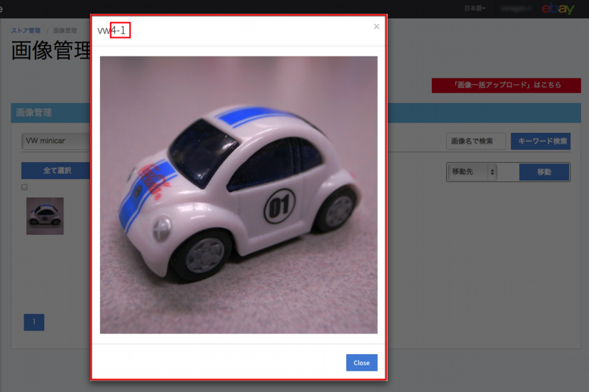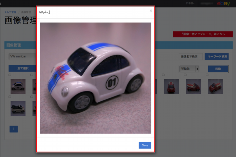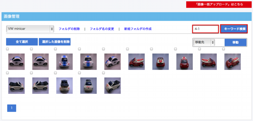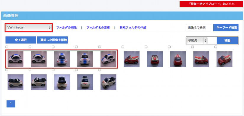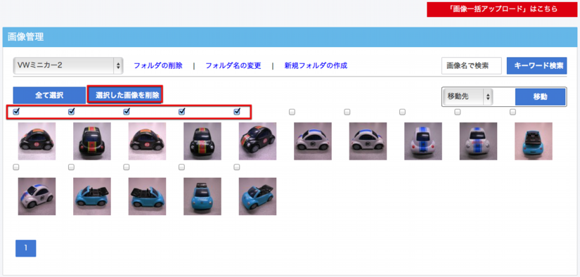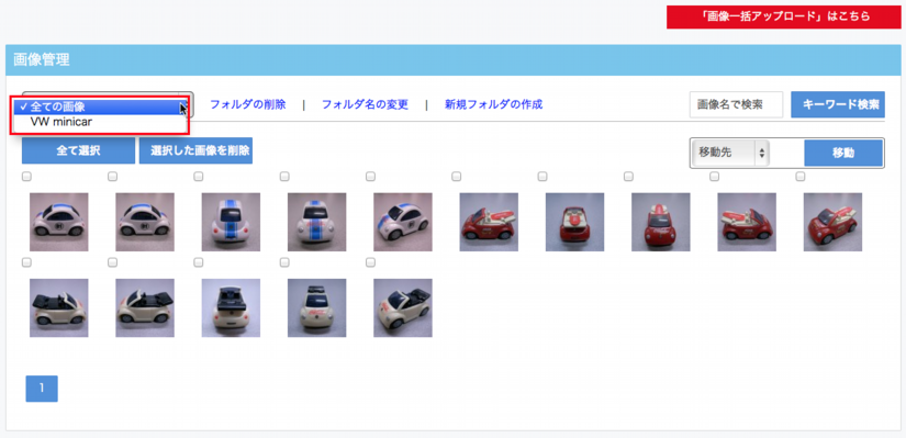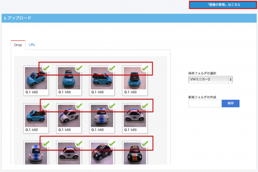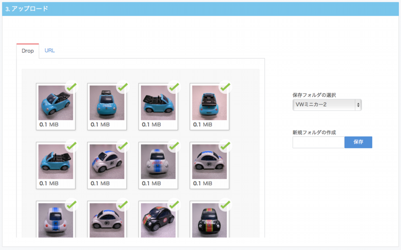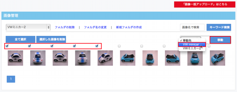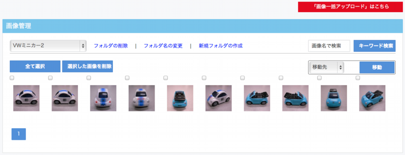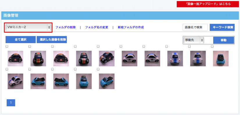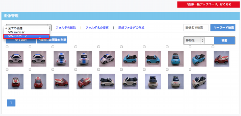プルダウンメニューでアップロードしたフォルダの「VWミニカー2」を選択すると、アップロードした画像が表示されます。