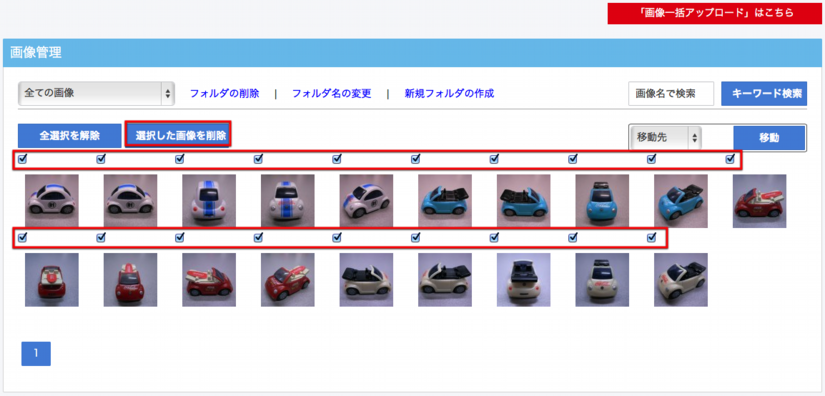 画像を削除したい場合は、画像の下のチェックボックスにチェックをいれて、「選択した画像を削除」をクリックします。