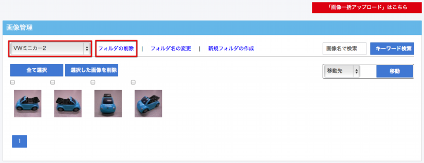 画像一括アップロードのページが開きますので、まずは画像を保存するフォルダーを選択するか、新規保存フォルダの作成で、新しいフォルダを作成します。