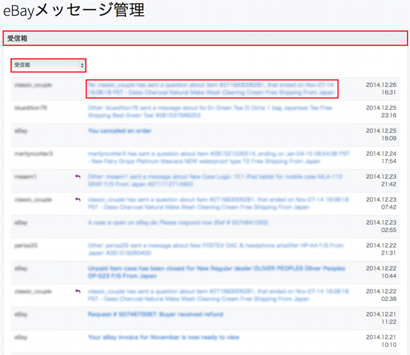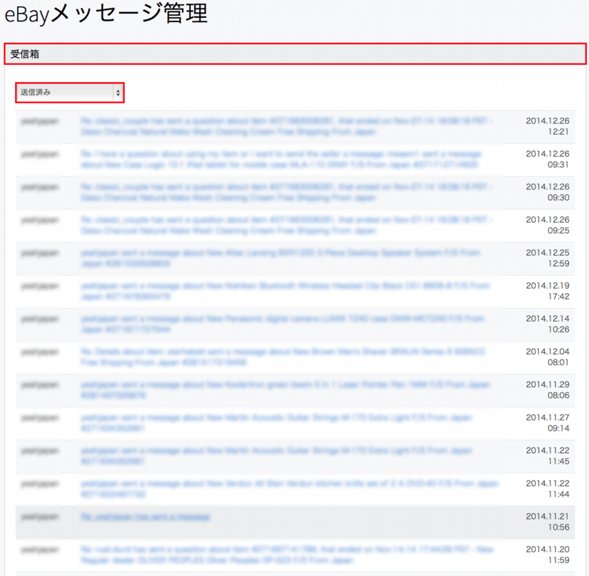 eBayからの案内、バイヤーさんからのメール等全てここで確認をすることが出来、ここから返信を刷ることが可能ですので、これからはわざわざeBayにログインをして確認する必要がありませんので、時間短縮になりますので是非ご利用下さい。