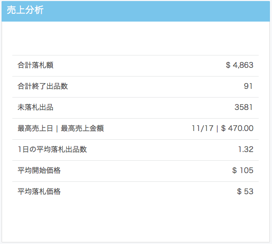 【1日の平均落札出品数】指定した期間の1日あたりの平均落札数を表示します。