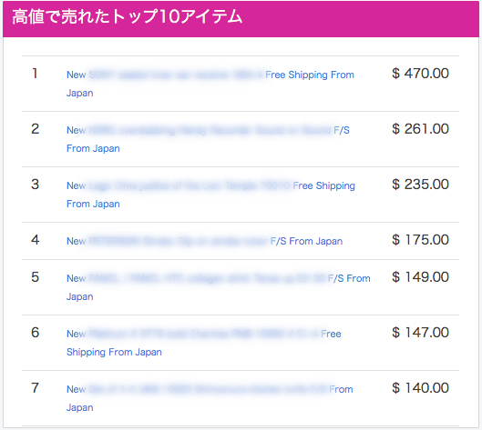 高額で販売した商品のトップ10のランキングがタイトルと金額で表示されます。