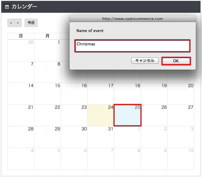 予定がある日をクリックすると、イベント名を入力し保存する事が出来ます。