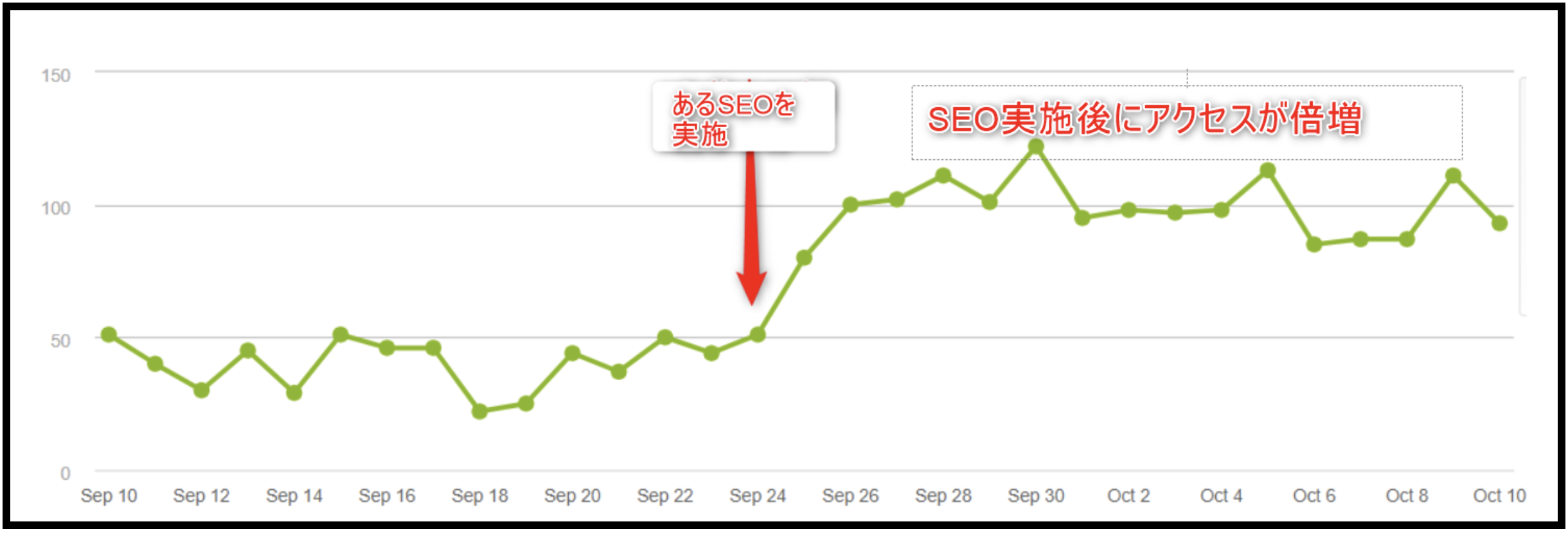 上記画像のように、SEOを実施することによって、アクセスや売上を伸ばしてくことができるようになります。