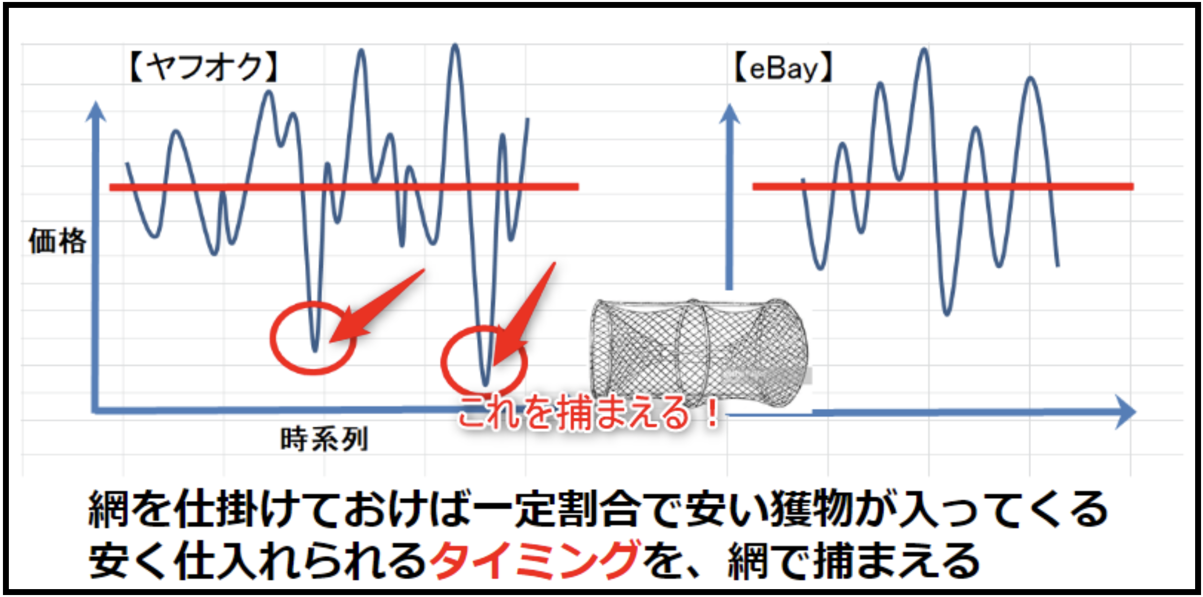 上記の図のように、ある商品について、国内のヤフオクも、海外のeBayも平均相場を見ると、似たような価格になり、利幅(価格差)が取れないように感じることがあります。