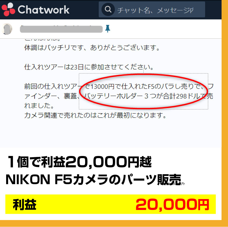 左記の受講生の事例では、13,000円で仕入れた不具合のあるNIKON F5B級品パーツとしてばらして、合計300ドルで販売し、2万円以上の利益がえられました。