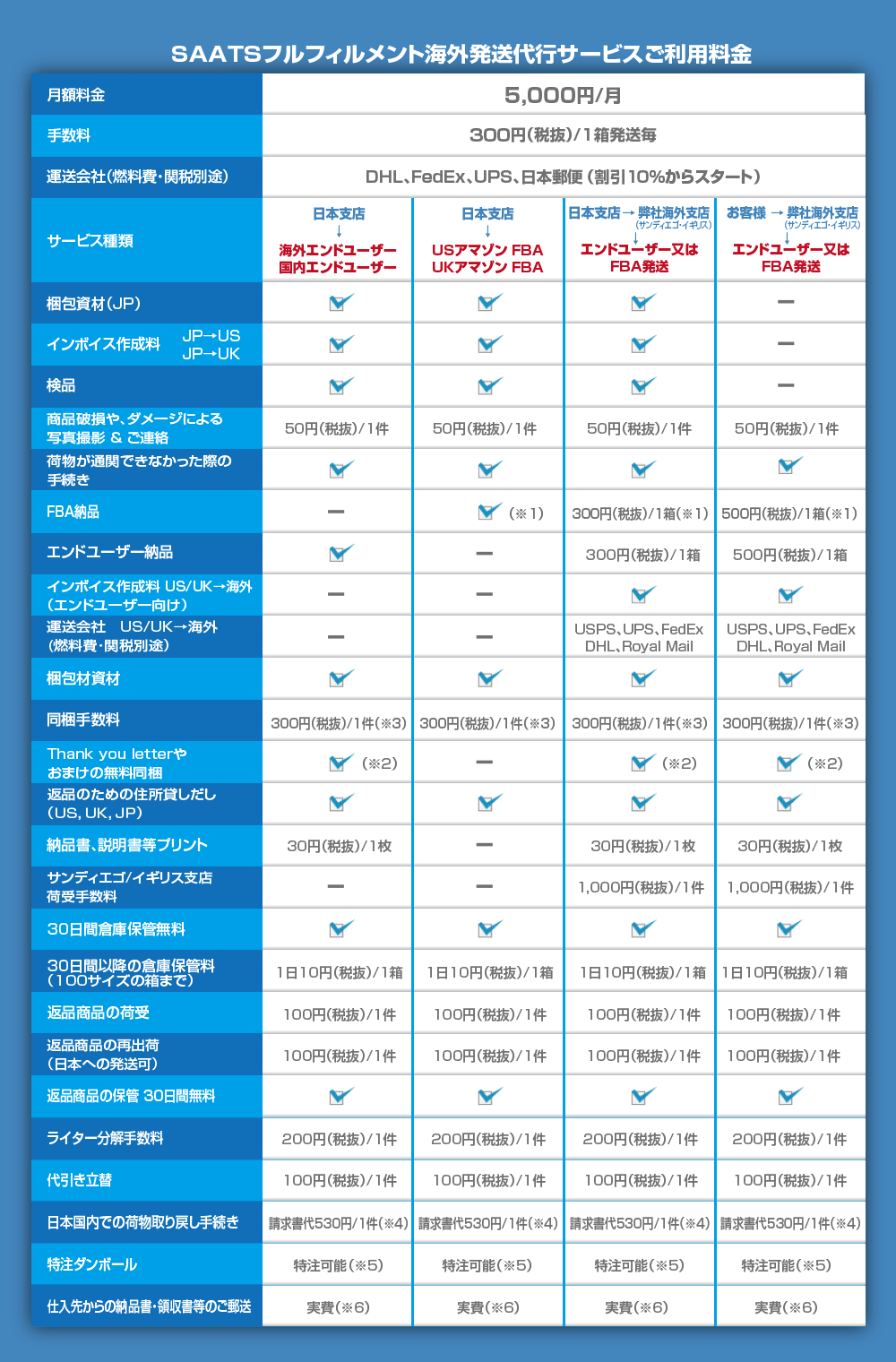 ※DHLとFedExサービスをご利用の場合のみ保証金として25.000円の預かり金をお支払い頂きます。※保証金はサービスの解約時に全額返金させて頂きます。