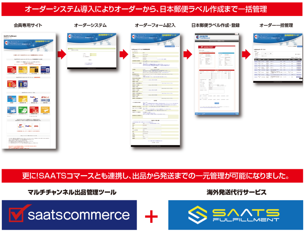 SAATSコマースと、SAATSフルフィルメントサービスのシステム連動により、SAATSコマースユーザー様は、SAATSフルフィルメントを利用して海外発送する際、落札後、バイヤーの住所が自動的にSAATSフルフィルメントのオーダーシステムに自動入力されるようになりました。これによりバイヤーの住所をコピペしてフルフィルメントシステムに貼り付けたりする必要もなく、日本郵便発送ラベル印刷後、追跡番号情報がSAATSコマースの落札管理に自動的にアップデートされ、発送済みにすることができます。2つのツールの連動により更に時間の節約が可能となります。