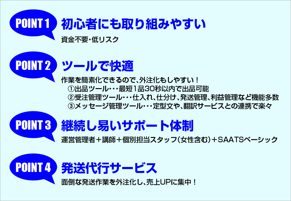 本講座への参加者には、優先して発送代行サービスをご案内いたします。副業の方など、発送作業に費やす時間が無い方などは、売上アップに注力いただくためにも、最初の外注化の1つとして、是非ご利用ください。料金は業界最安です!(当社調べ)