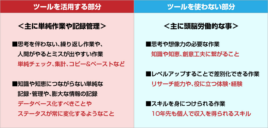 ツールを使うことで、生産性の低い作業はツールに任せ、より生産性が高く、継続的な収益化に繋がる、差別化の図れるスキルアップのために時間を作ることができます。